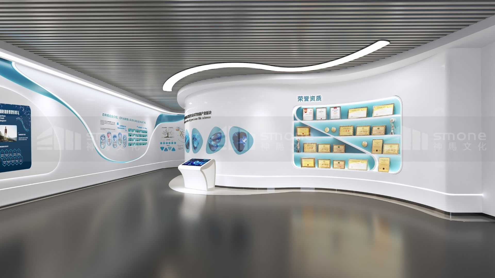 在多媒体展示装置上,利用人体模型扫描,扫描展示自体干细胞治疗法;利用返老还童装置,让访客有一个被干细胞抚平岁月痕迹的神奇体验。装置设计与展示主题的形象统一,能增强访客的体验感和情感共鸣,从而加深对干细胞和企业的了解。