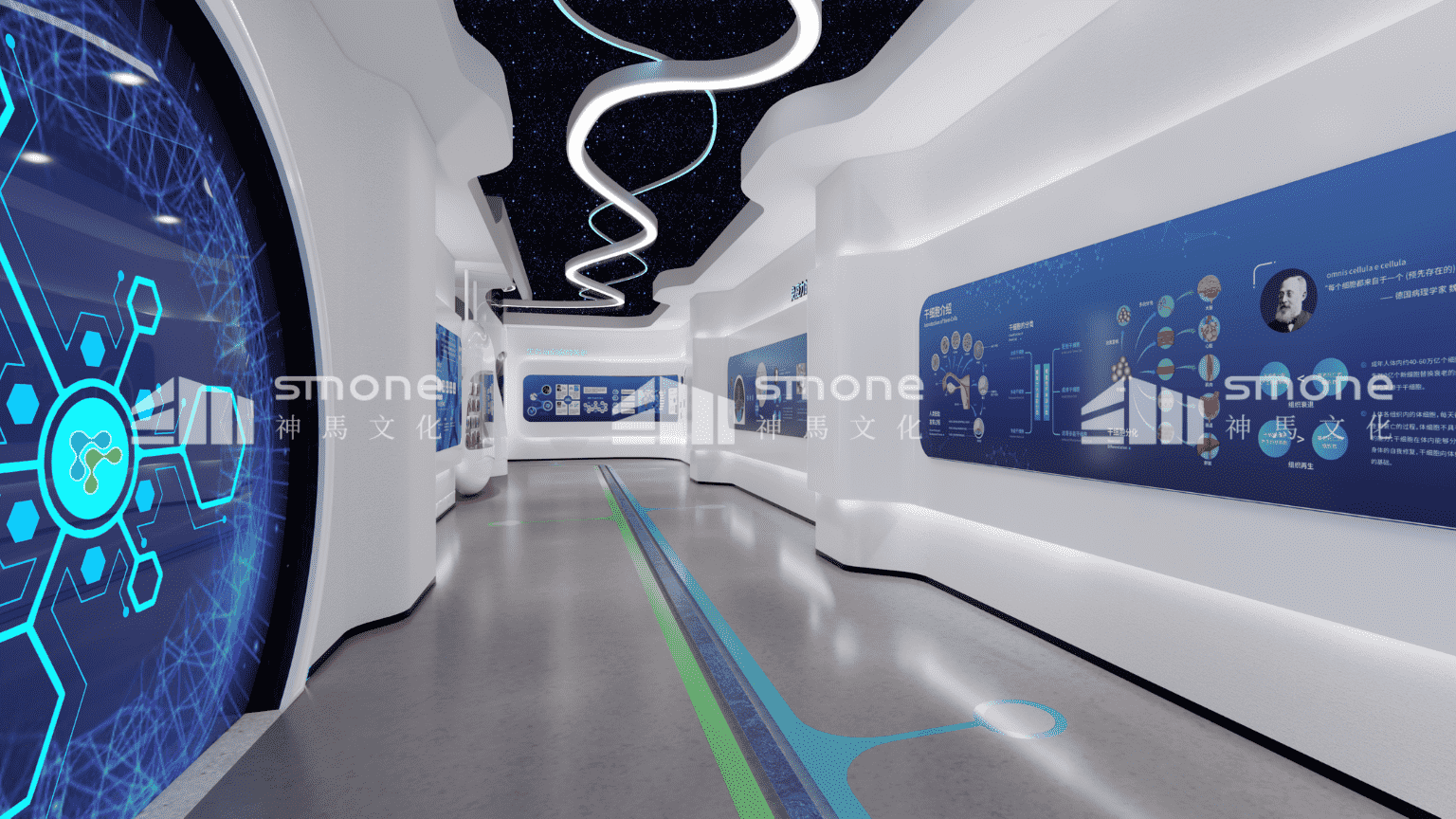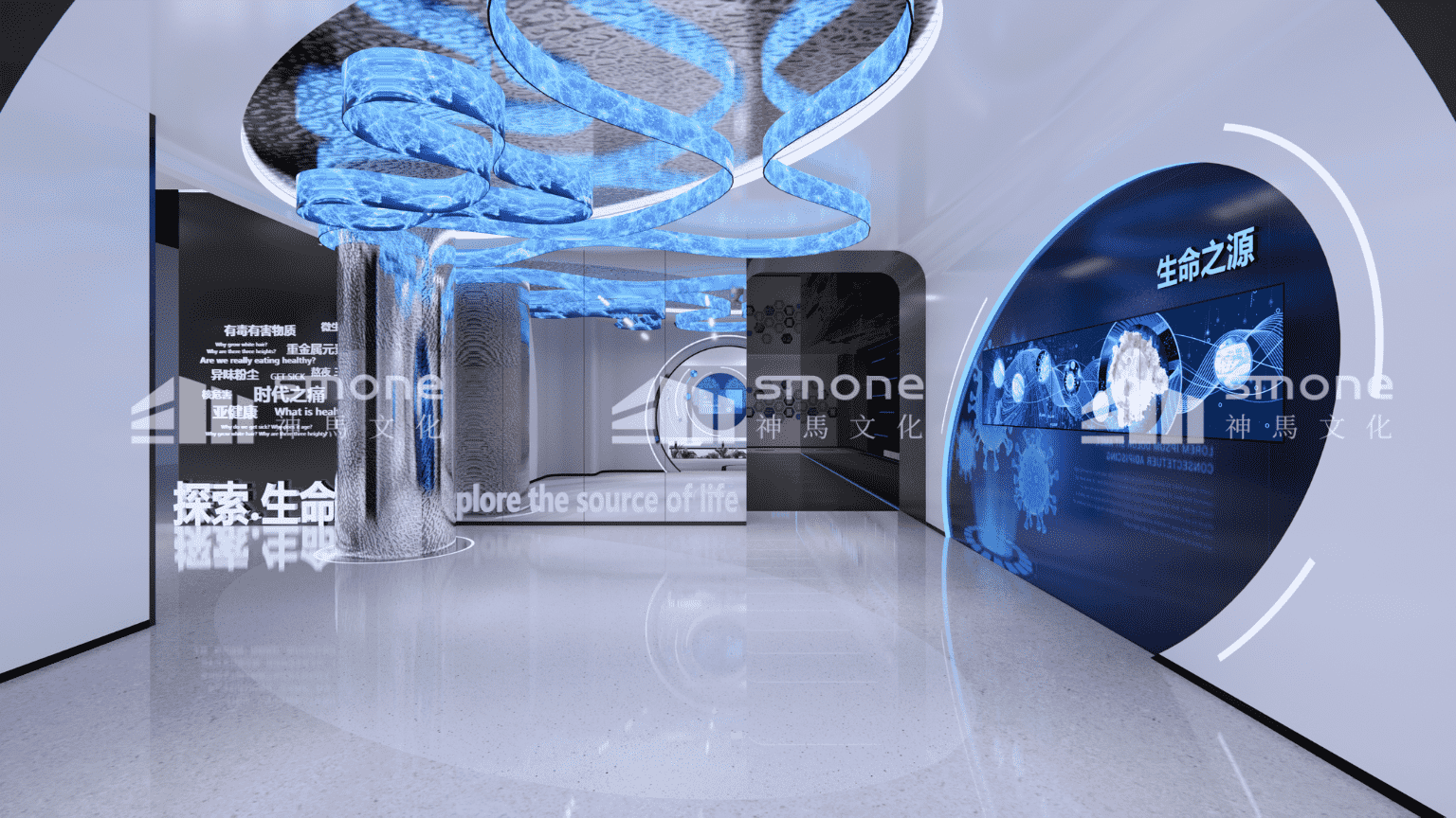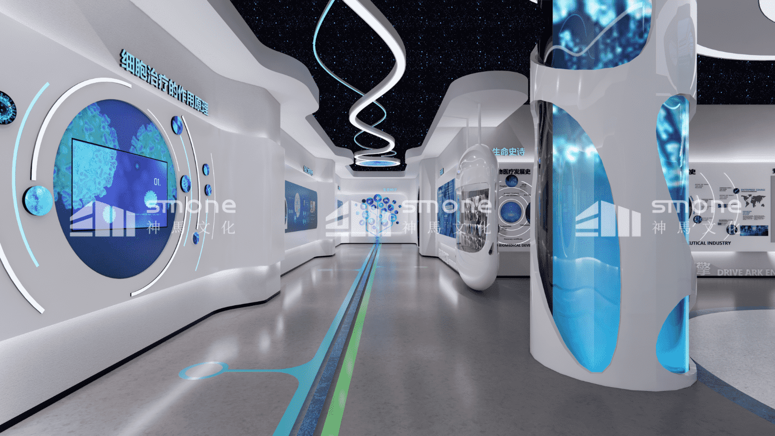 在安可瑞细胞体验展厅的设计中,神马文化通过控制灯光色彩和强度,来为不同区域营造不同的氛围,让观展更加地舒适。 通过沉浸式空间的打造,给观者带来身临其境的感觉。以细胞之门开启细胞的探索之旅;“星空”里流动感的天花造型带领观众一路游览至“生命能源补给站”。寓意着细胞技术能源的输进输出以及生命的流动。