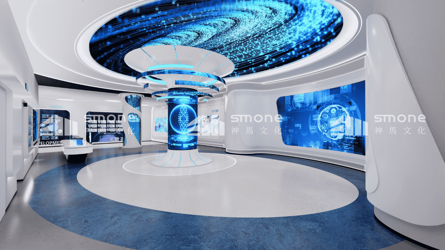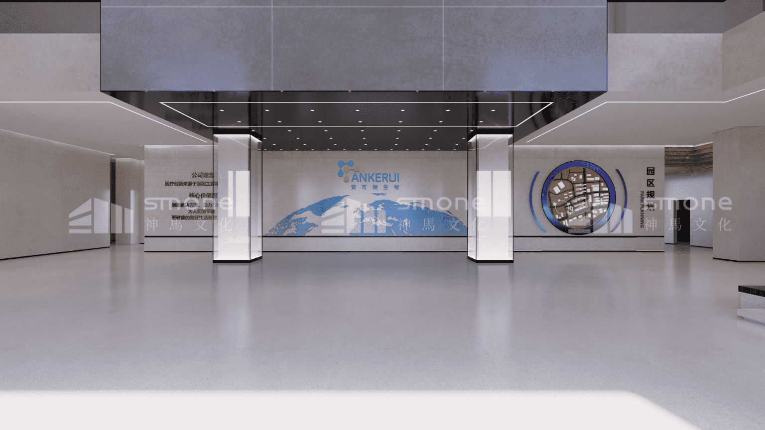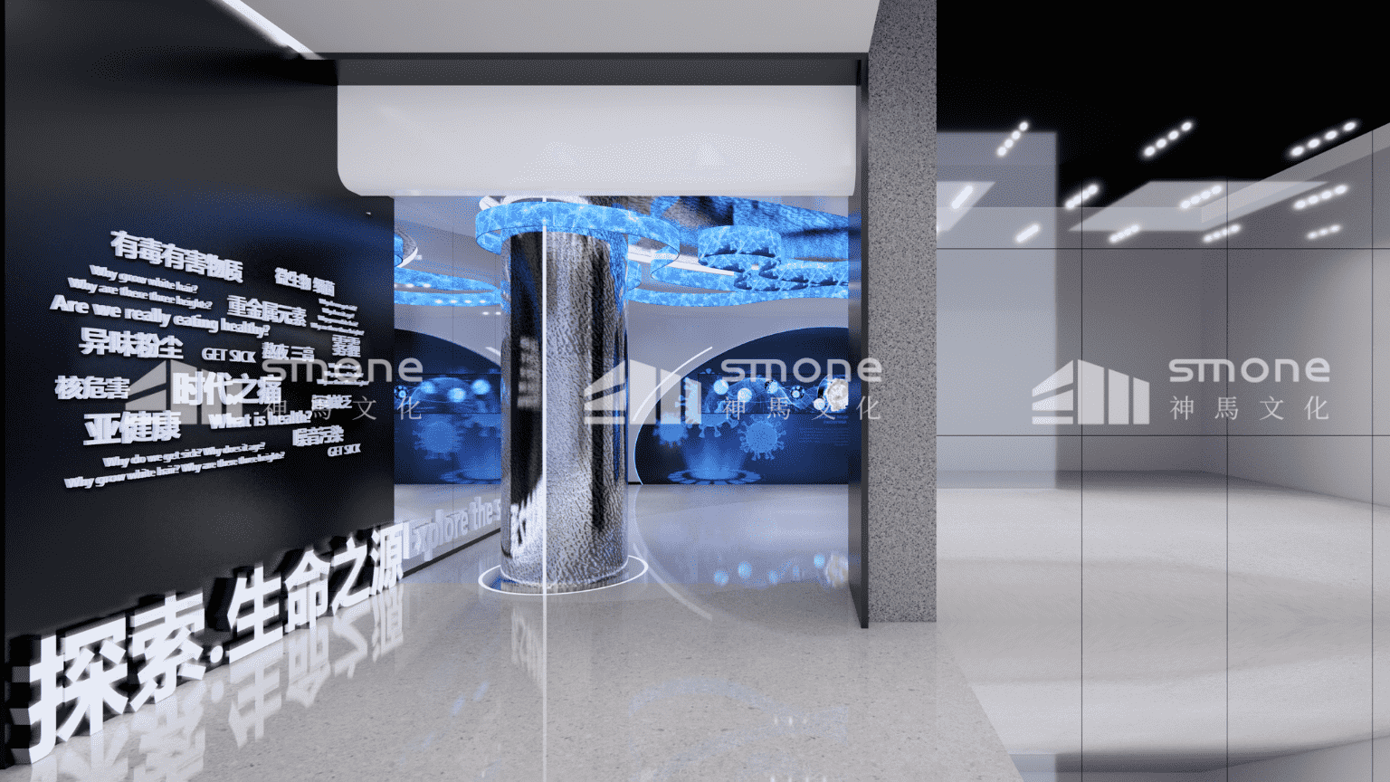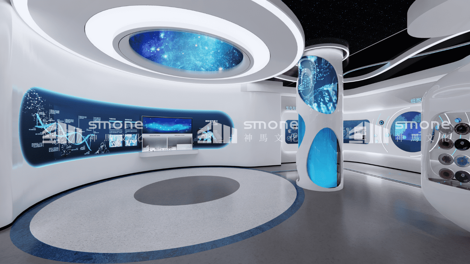 在安可瑞细胞体验展厅的设计中,神马文化通过控制灯光色彩和强度,来为不同区域营造不同的氛围,让观展更加地舒适。 通过沉浸式空间的打造,给观者带来身临其境的感觉。以细胞之门开启细胞的探索之旅;“星空”里流动感的天花造型带领观众一路游览至“生命能源补给站”。寓意着细胞技术能源的输进输出以及生命的流动。