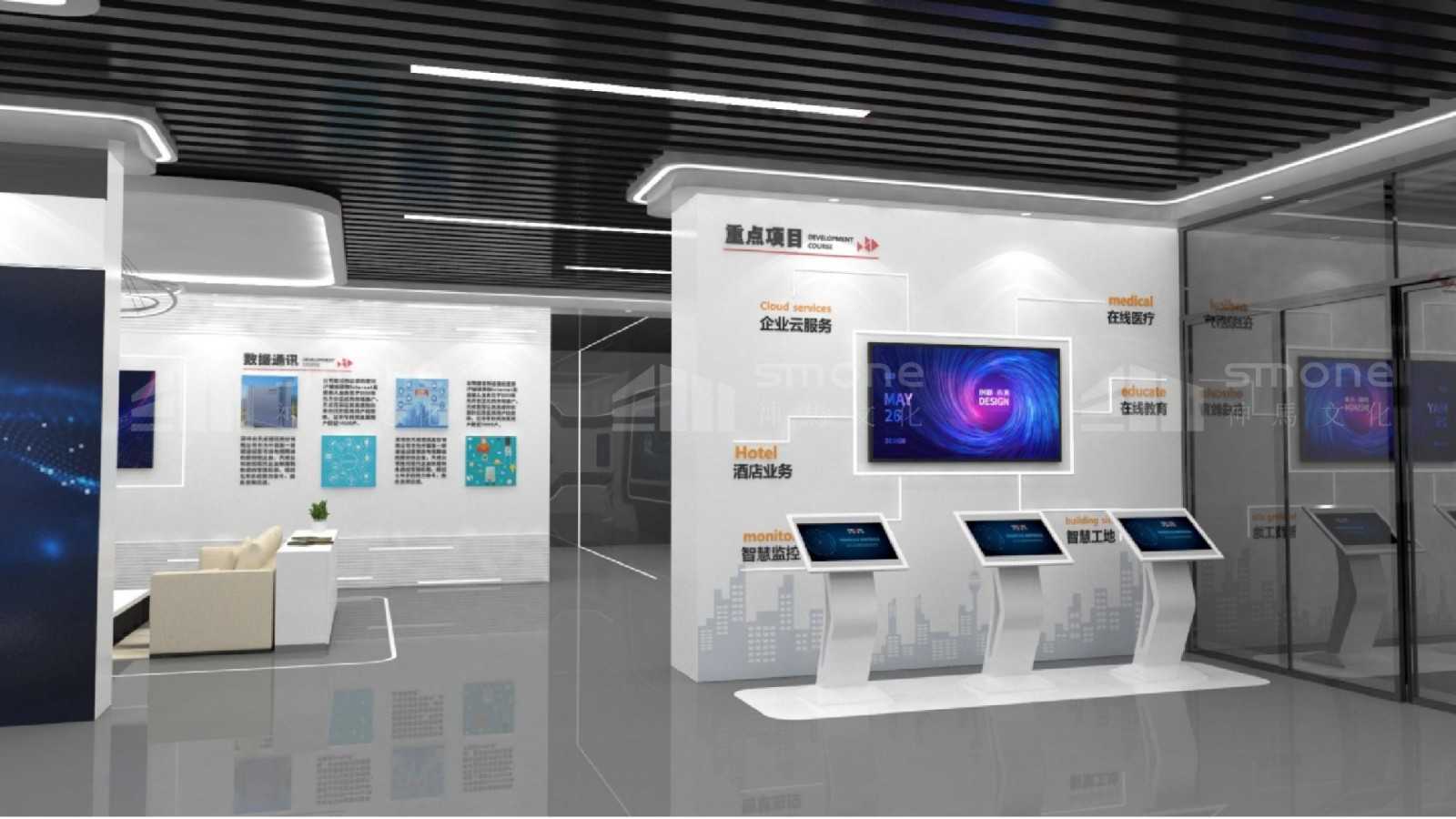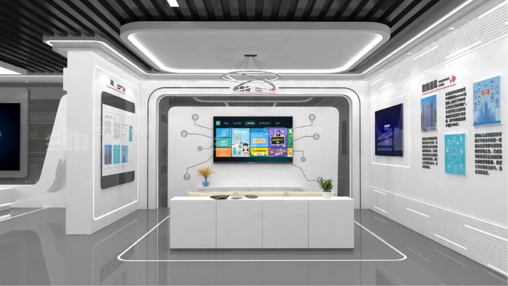 天威视讯企业展厅,位于深圳广电文创中心2楼 , 建筑面积520平米 , 涵盖展厅、 企业概况、 业务、 技术、 服务方面的创新及实力介绍等多种功能。