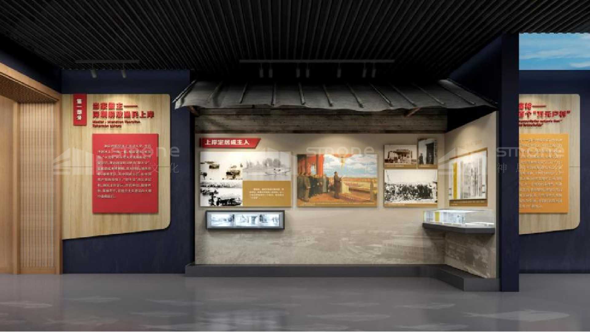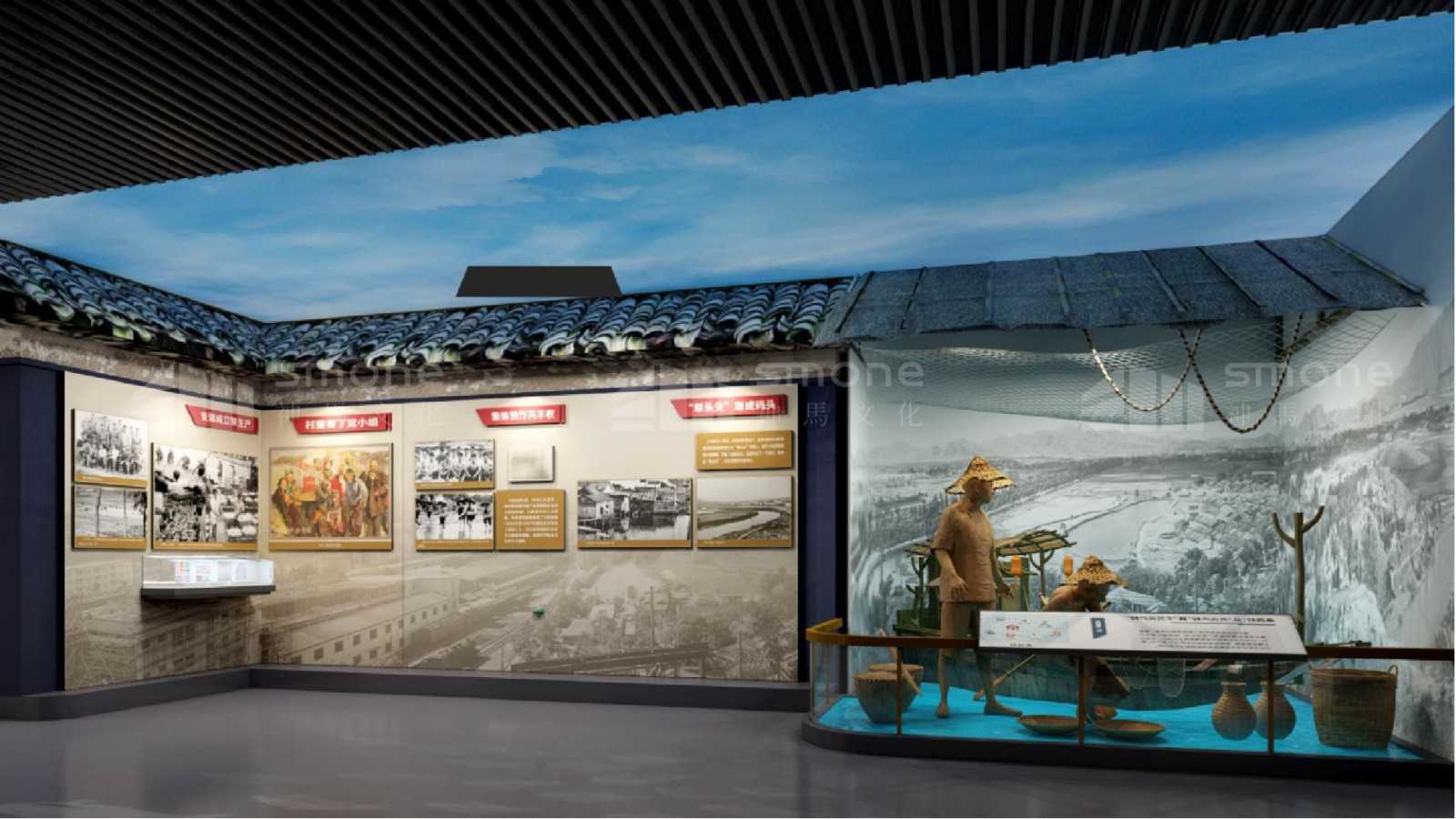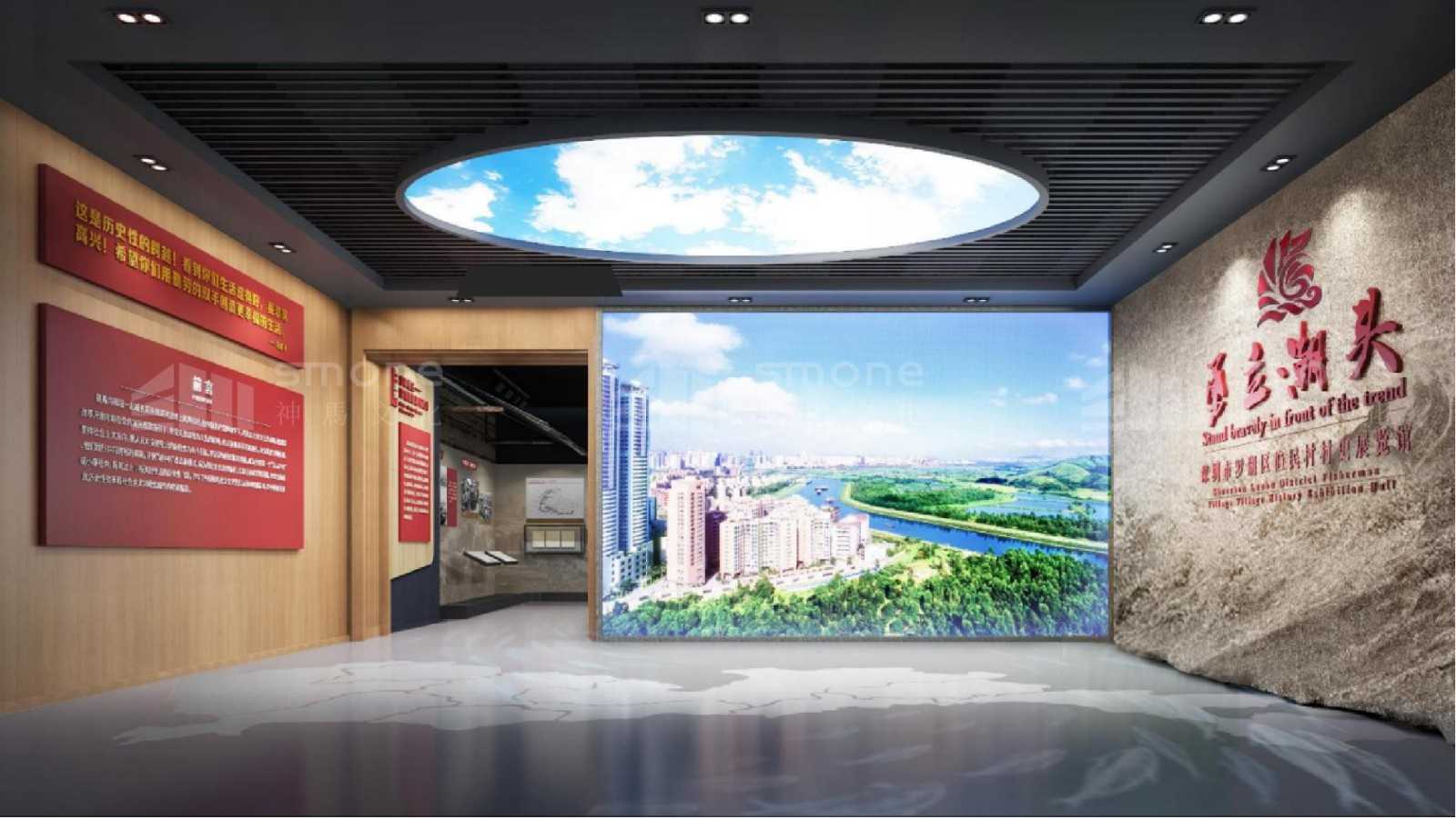渔民村作为见证深圳改革开放成就和变化的一个窗口 ,村史展览馆的定位就是一个成就展。 主要展示渔民村在党和政府的领导下, 特别是改革开放几十年来的巨大变化和发展成就,穿插体现政治高度,加入现代特色的半场景式设计,增添展示空间的年代韵味。